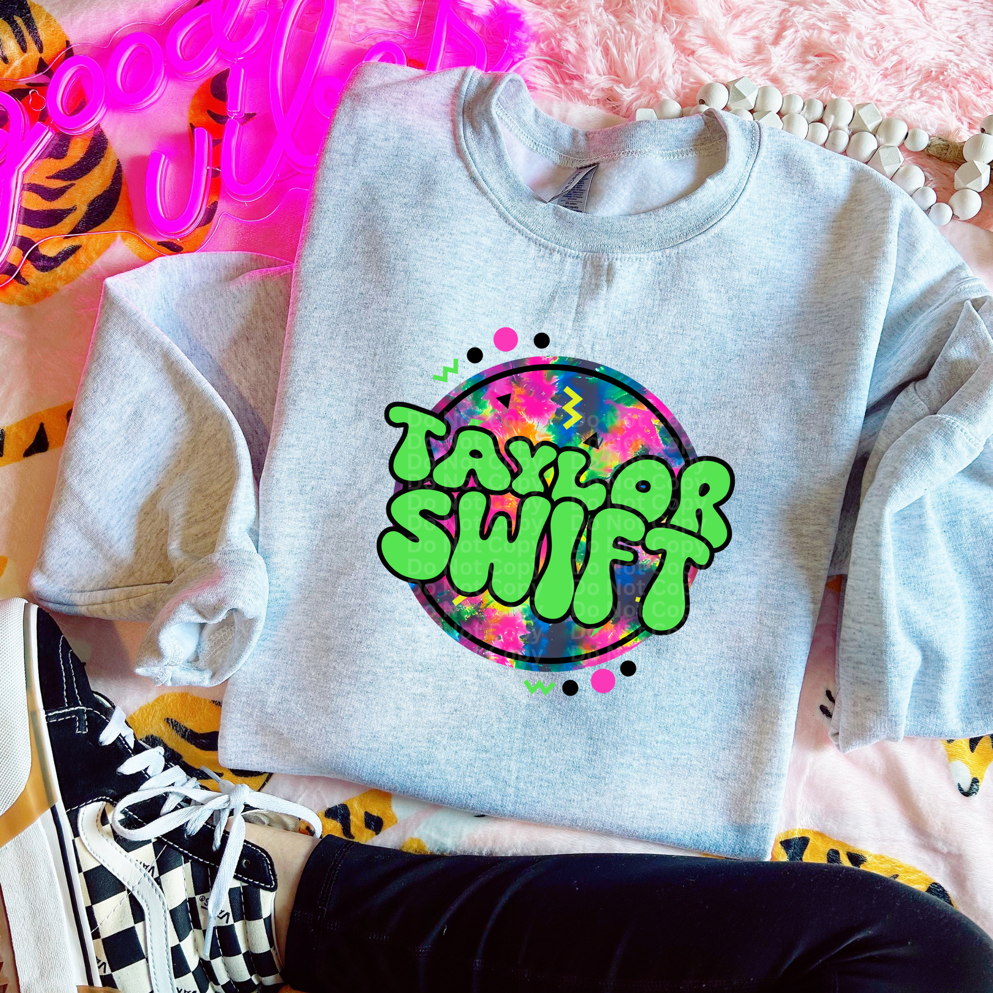T Sw!ft Green Letters over Tye-Dye Circle DTF Transfer