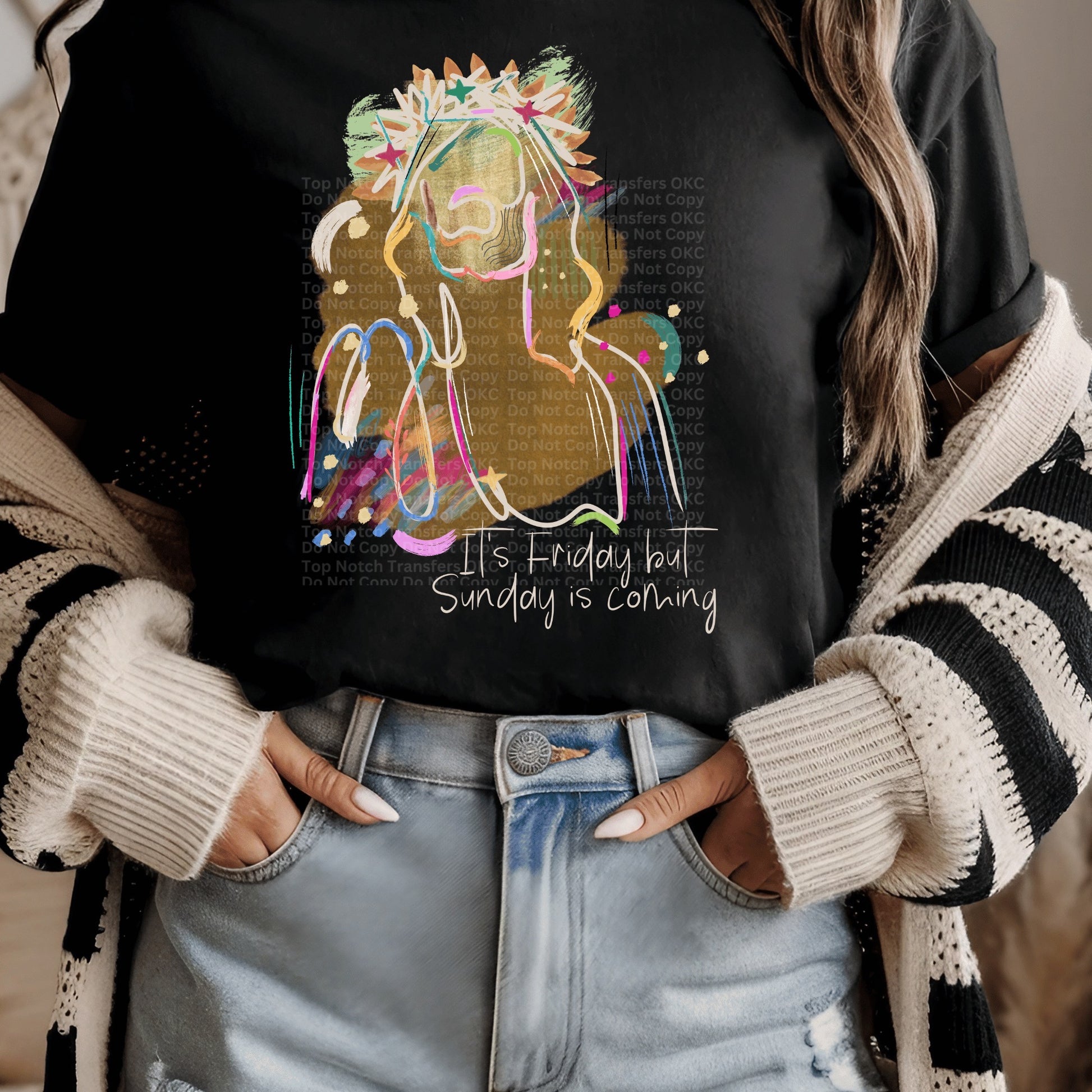 It’s Friday But Sunday Is Coming White Text DTF Transfer