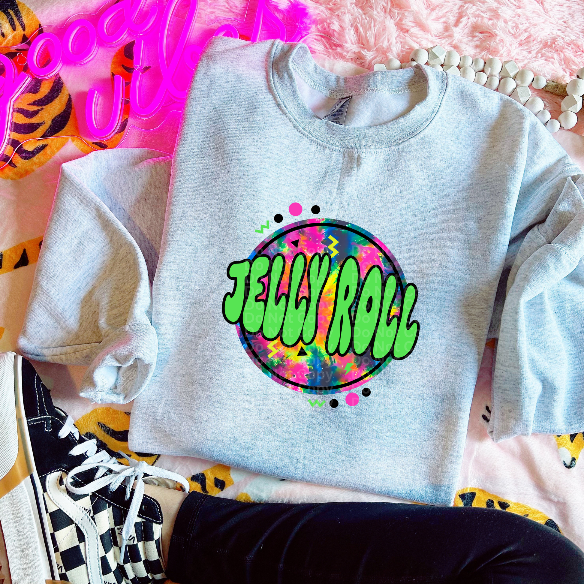 Je11y Ro11 Green Letters over Tye-Dye Circle DTF Transfer
