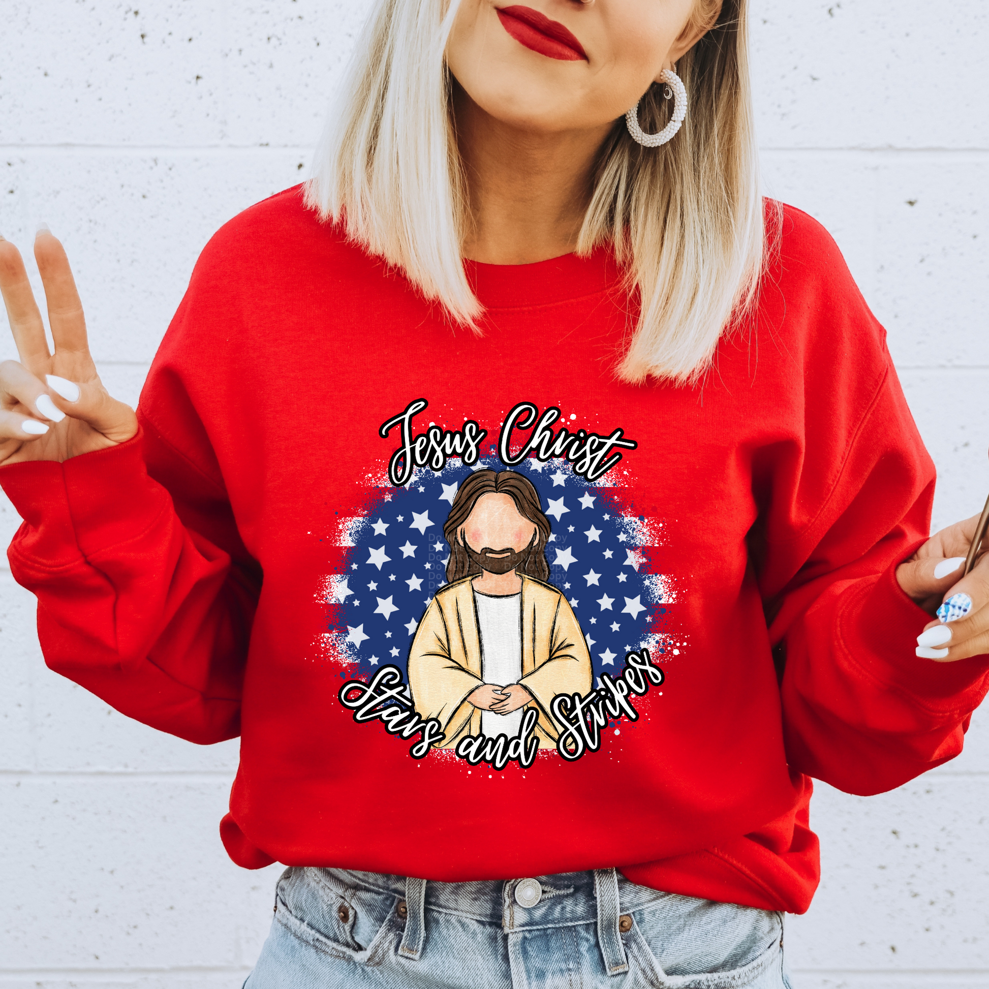 Jesus Christ Stars and Stripes Blue with White Star & Faded Stripes Background (White Lettering) DTF Transfer