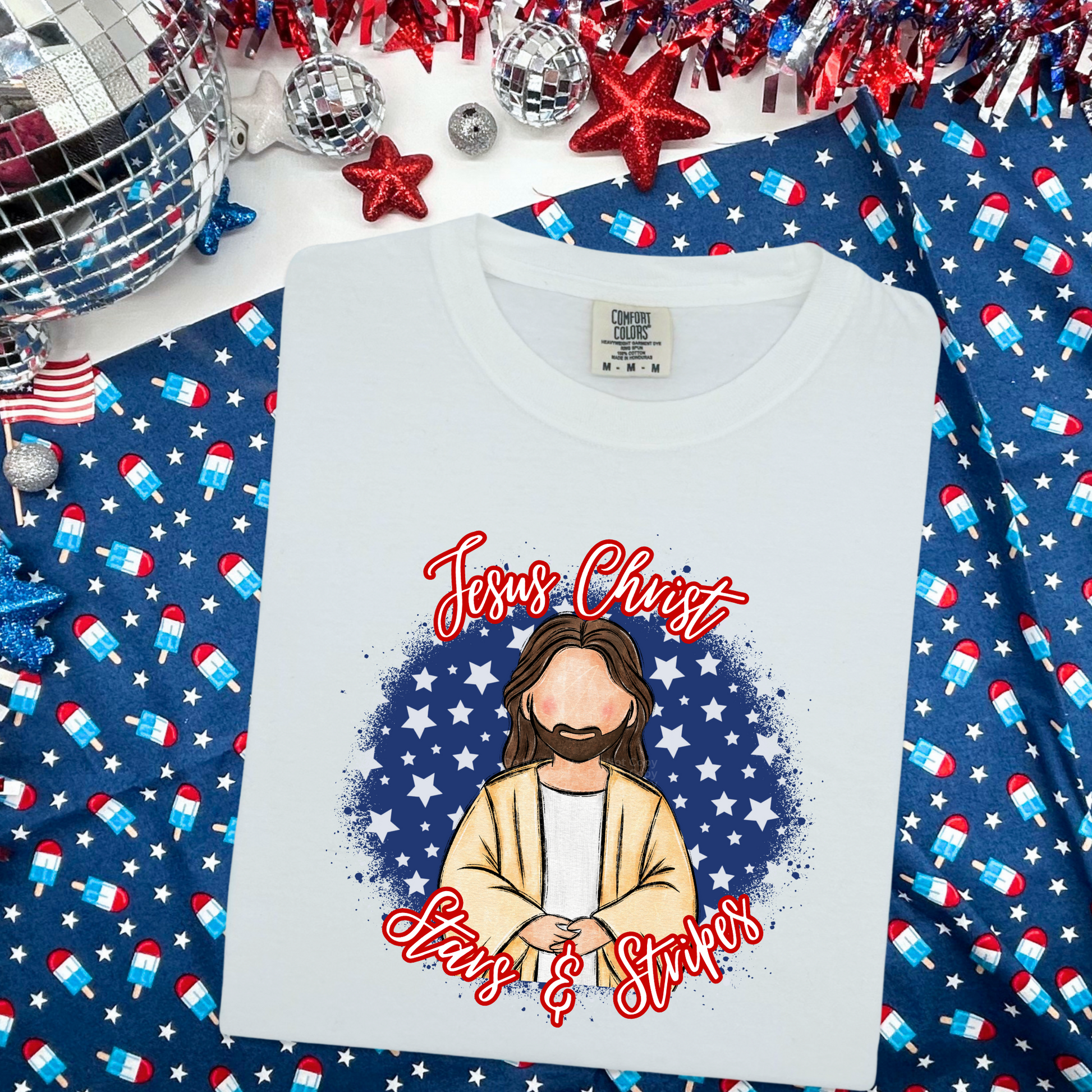 Jesus Christ Stars and Stripes Blue with White Star Background DTF Transfer