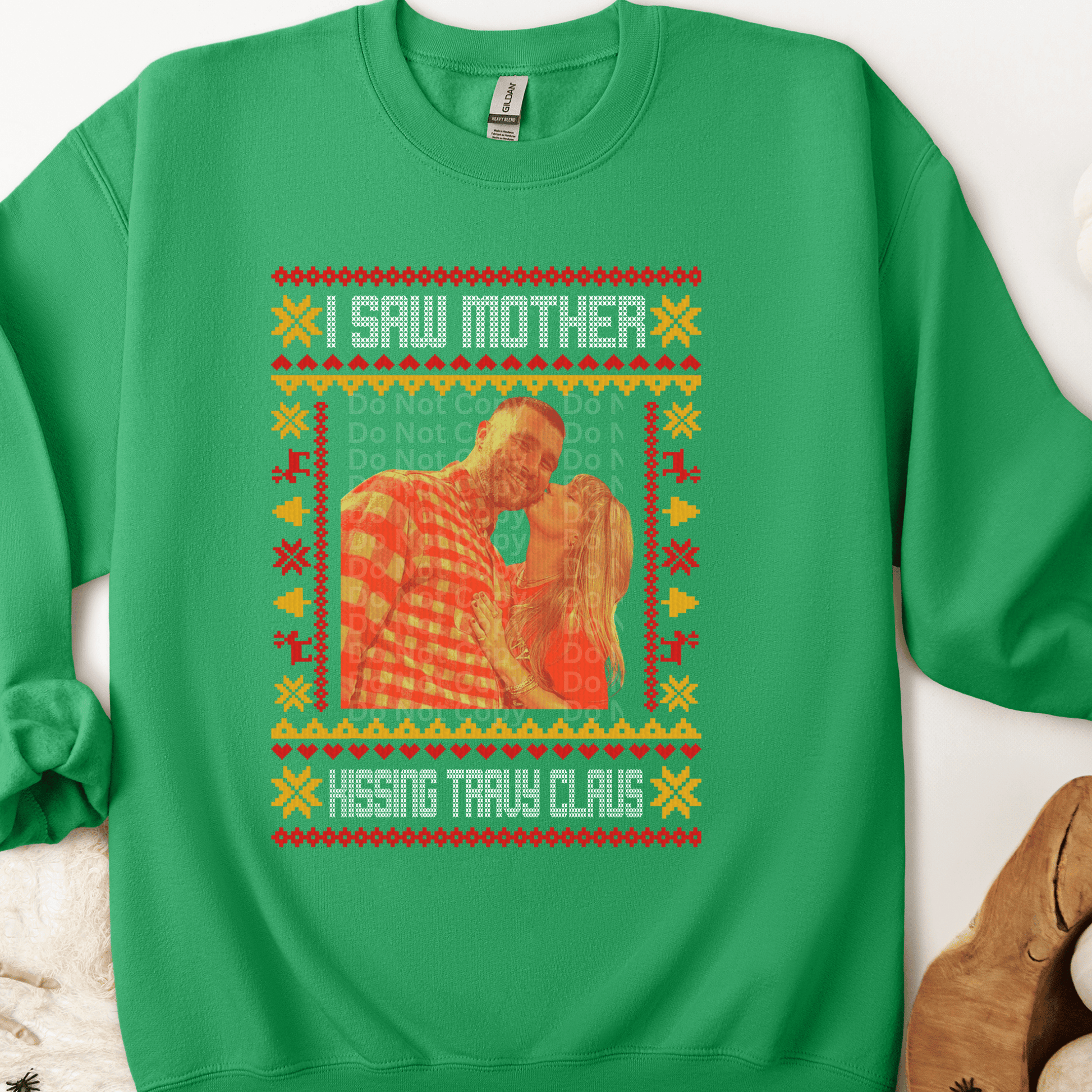 Kissing Travy Claus White Text Ugly Christmas Sweater DTF Transfer