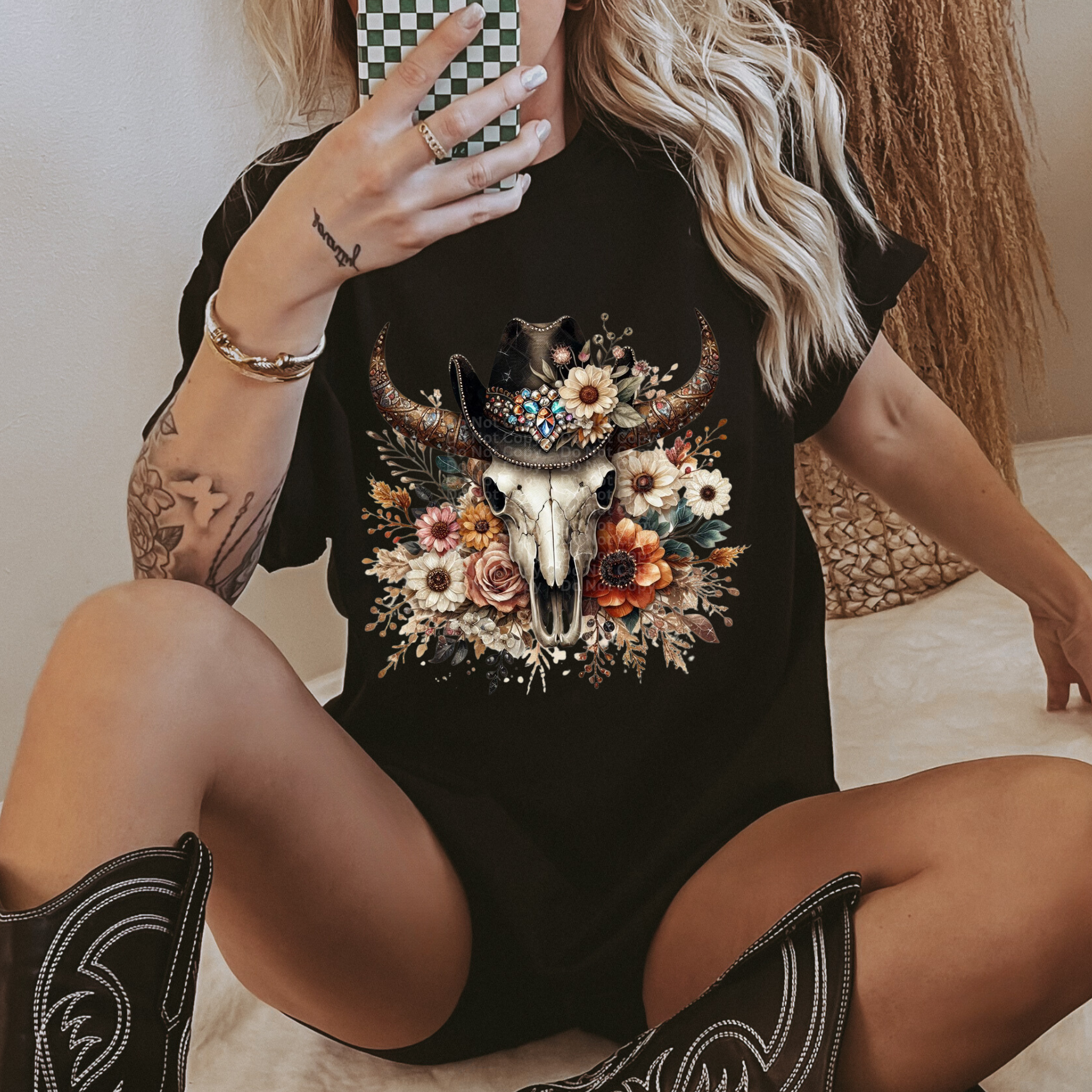 Skull with Flowers & Black Hat DTF Transfer