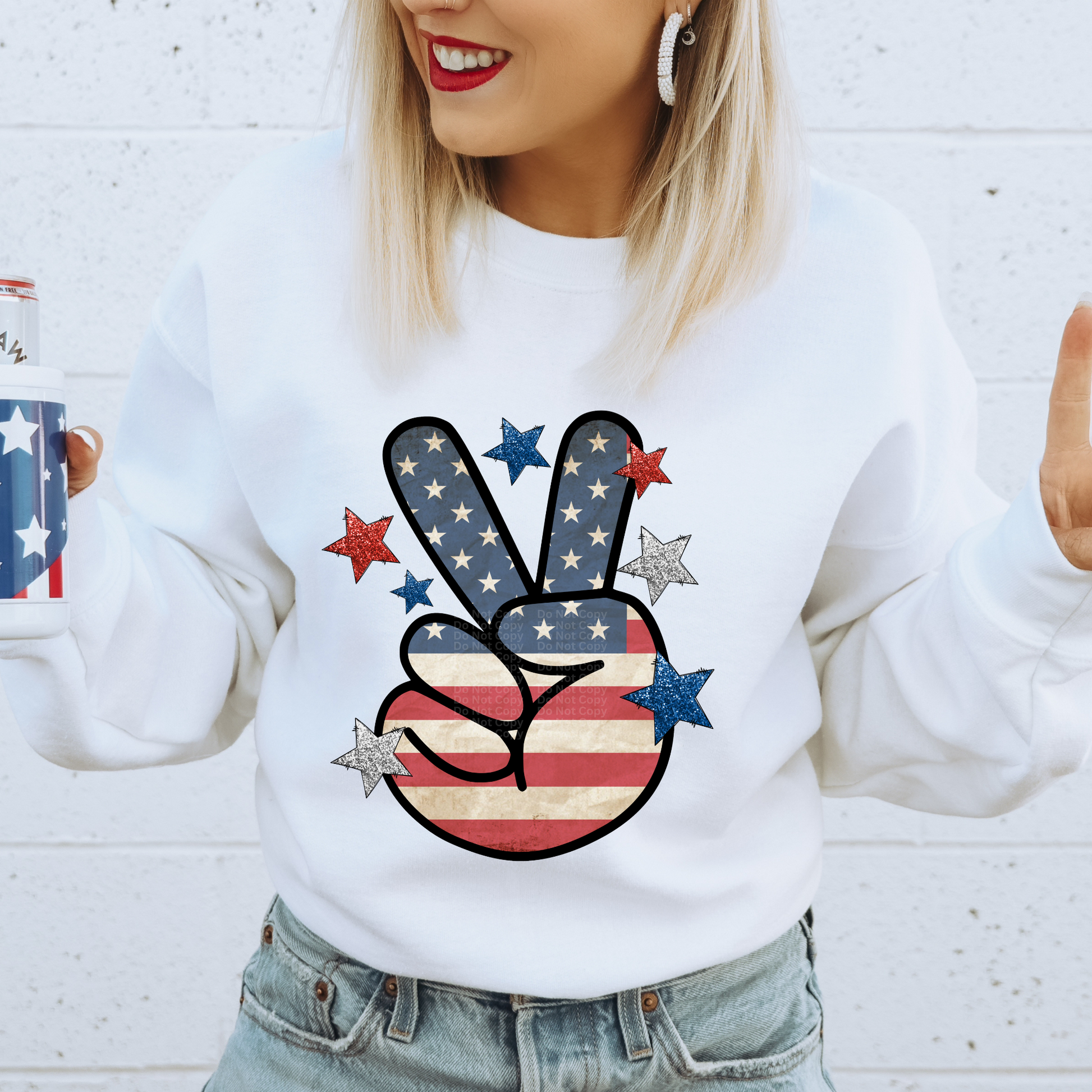 Patriotic Peace Hand with Faux Glitter Stars DTF Transfer