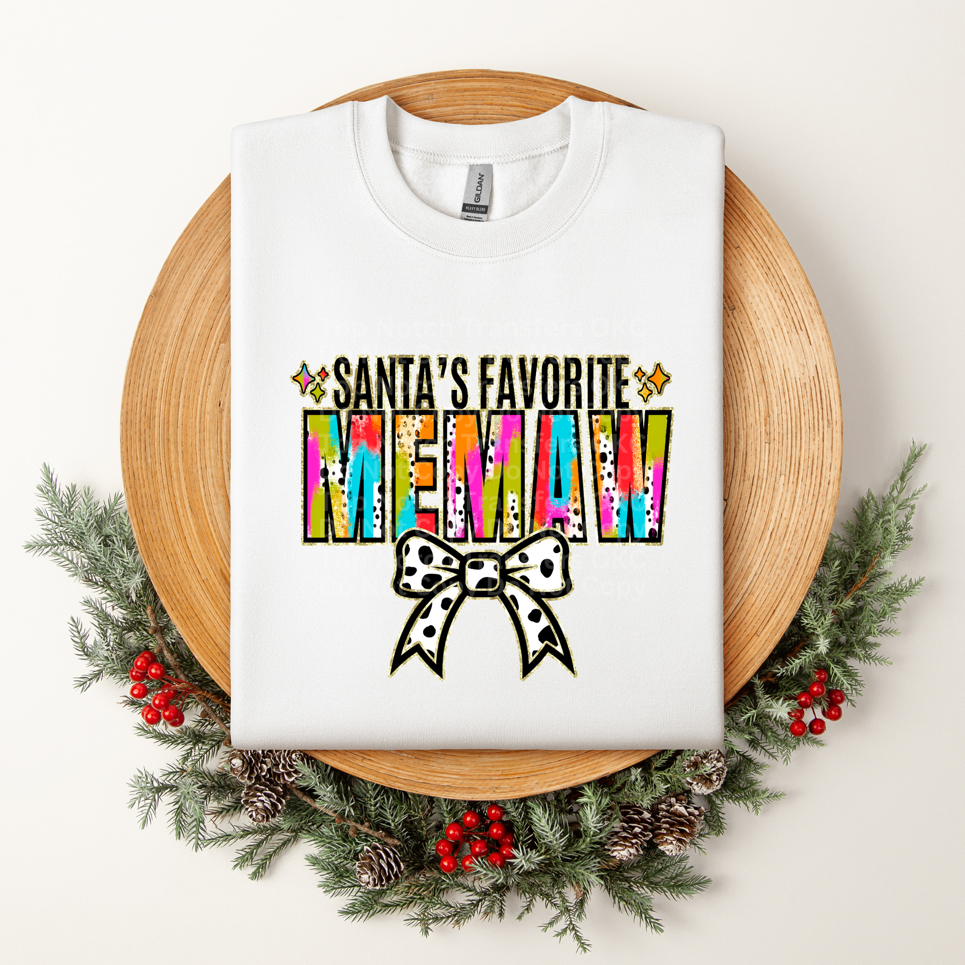 Santa's Favorite Memaw Multicolored w/White Bow DTF Transfer