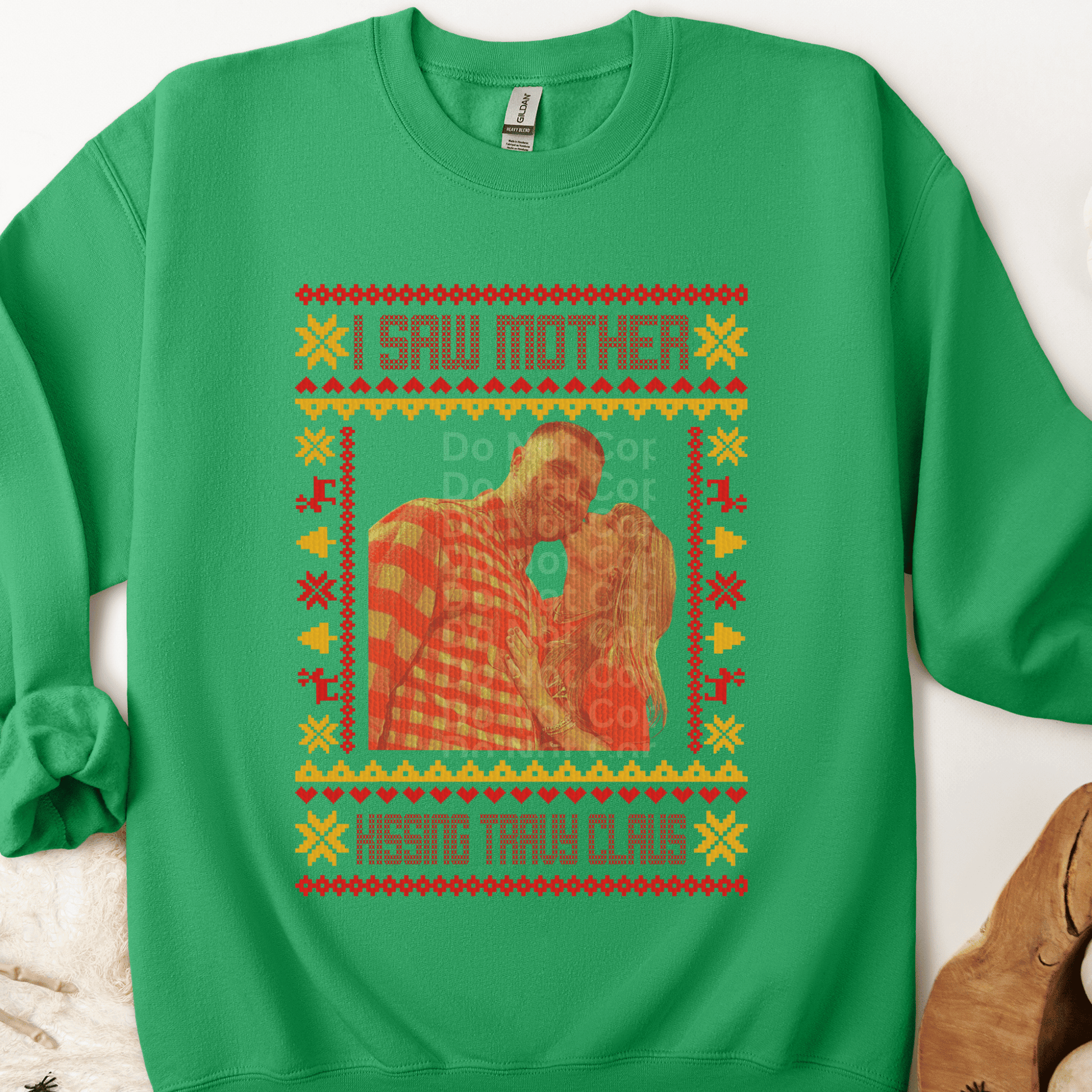 Kissing Travy Claus Red Text Ugly Christmas Sweater DTF Transfer