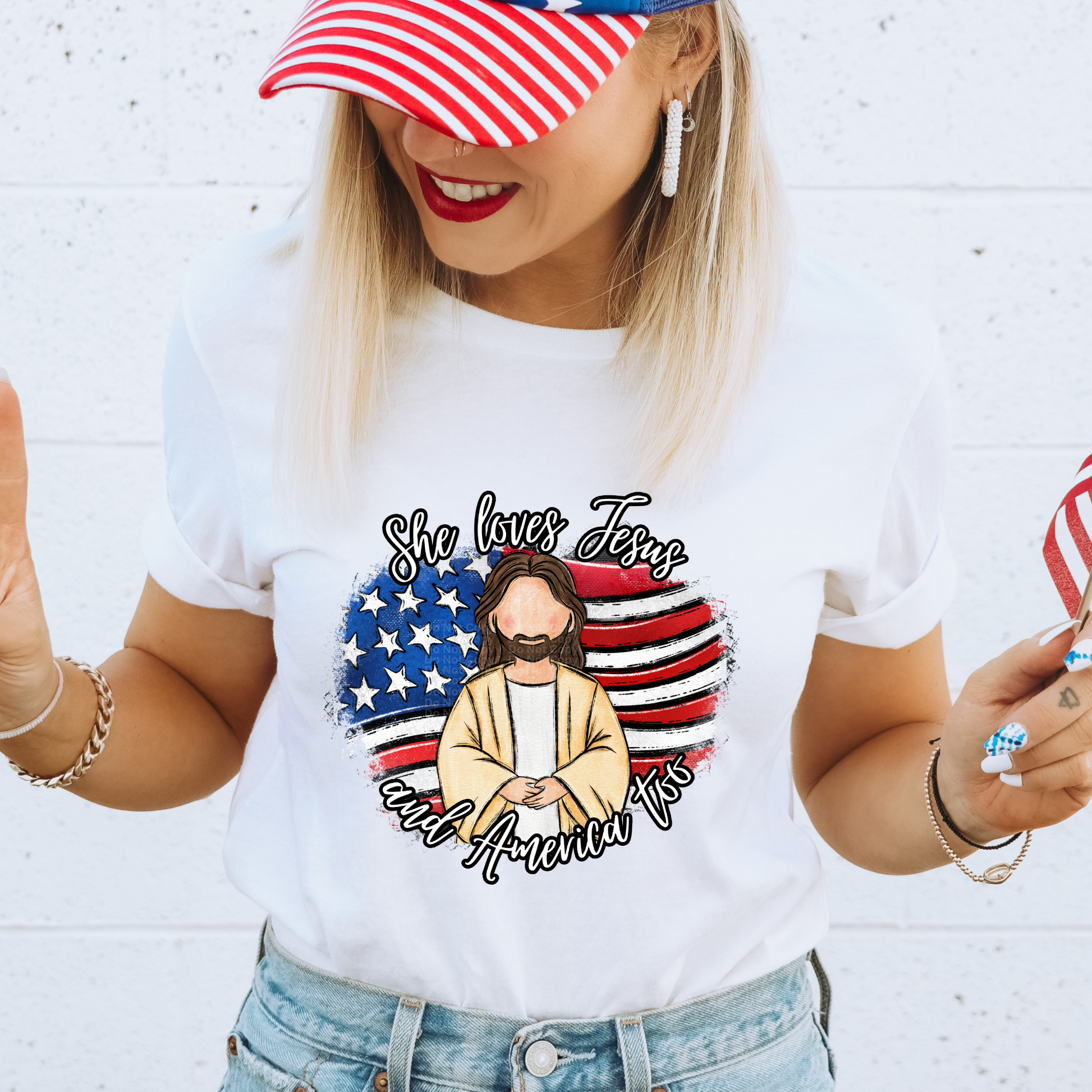 She Loves Jesus and America Too (White Lettering) DTF Transfer